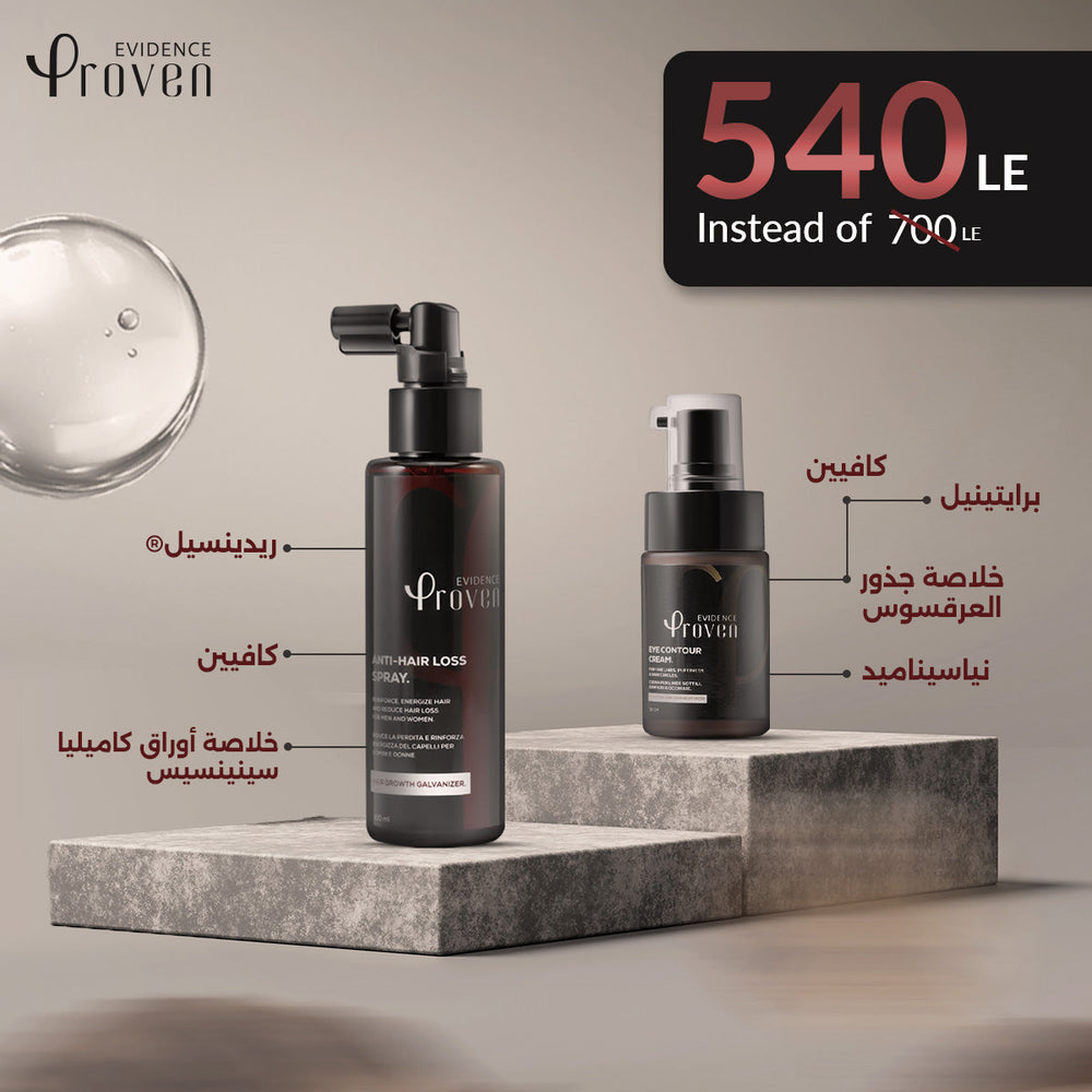 اسبراي مقاوم لتساقط الشعر بتركيبة مميزة تعمل من أول استخدام على تقليل إفراز الدهون، تحفيز نمو شعر جديد وزيادة كثافته وتقوية جذور الشعر مع كونتور العين المعالج لمحيط العين يحمي محيط العين من الالتهابات، يقلل الانتفاخات والهالات حول العين، يقلل ظهور الخطوط الرفيعة ويقلل الميلانين المُسبب للتصبغات.